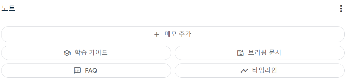 NotebookLM은 여기서 더 나아가, 아래와 같이 메모 기능, 학습 가이드 생성 기능, 브리핑, FAQ, 그리고 타임라인 기능을 도입했습니다.